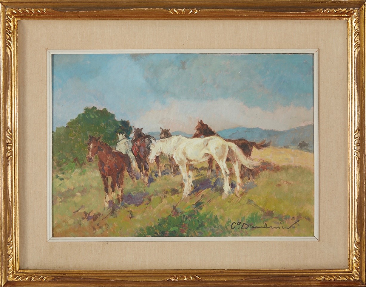 Carlo Domenici (Livorno, 18/03/1897 - Portoferraio, 29/06/1981) "Paesaggio con cavalli" Olio su faesite Cm 35x50