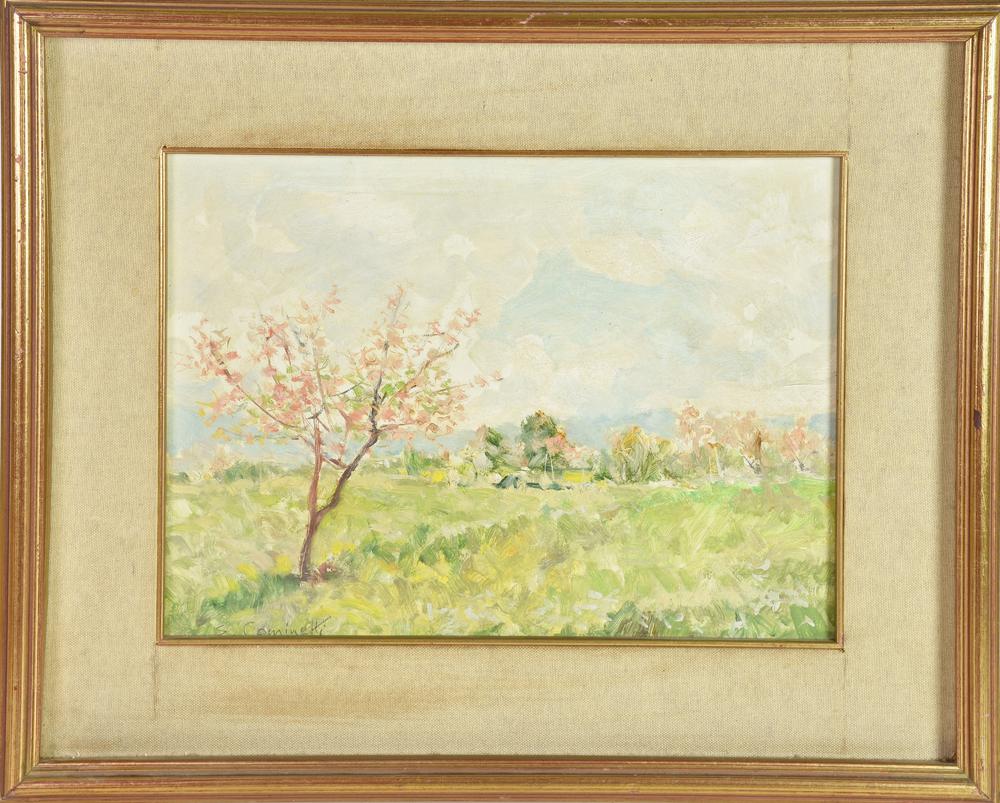 Enrico Cominetti FIORITURA A RIVALTA, 1978 olio su masonite, cm 30x40 firma...