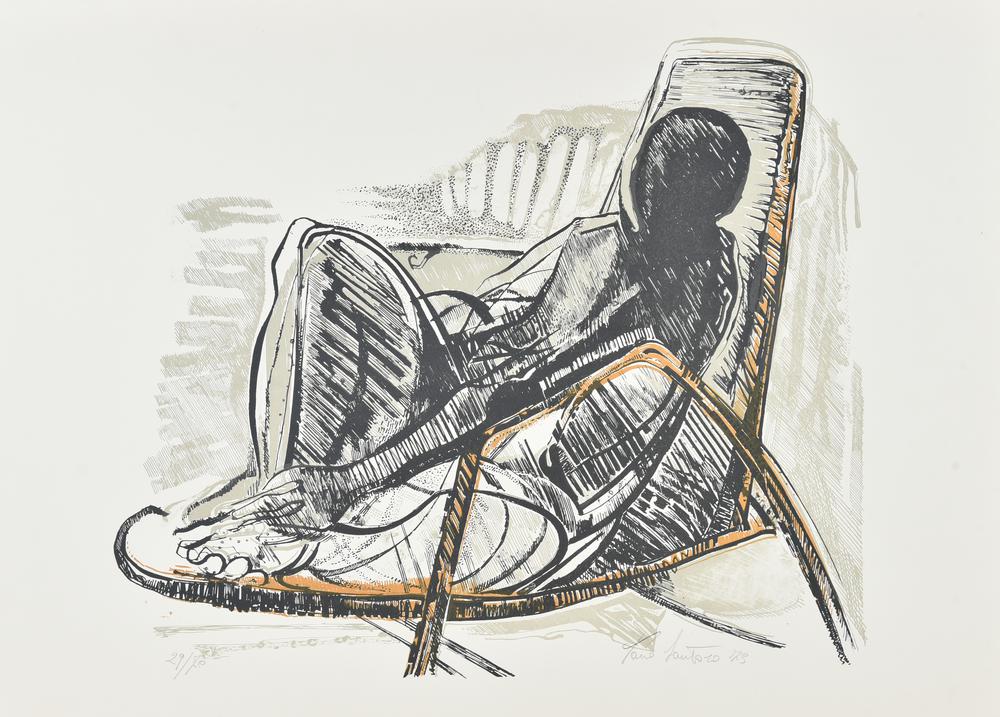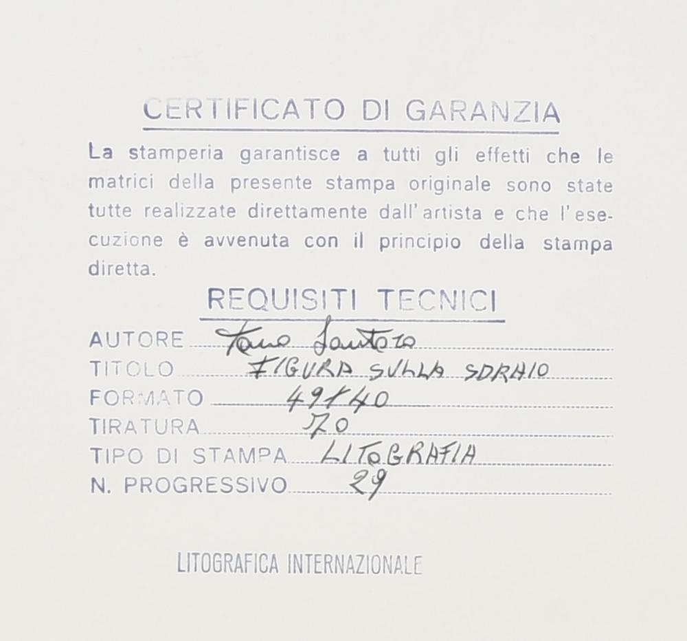 Tano Santoro FIGURA SULLA SDRAIO, 1973 litografia, cm 50x70; es. 29/70 firma,...