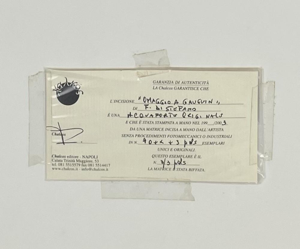 F. Di Stefano OMAGGIO A GAUGUIN acquaforte, cm 33x26,5, su foglio cm 48x33;...
