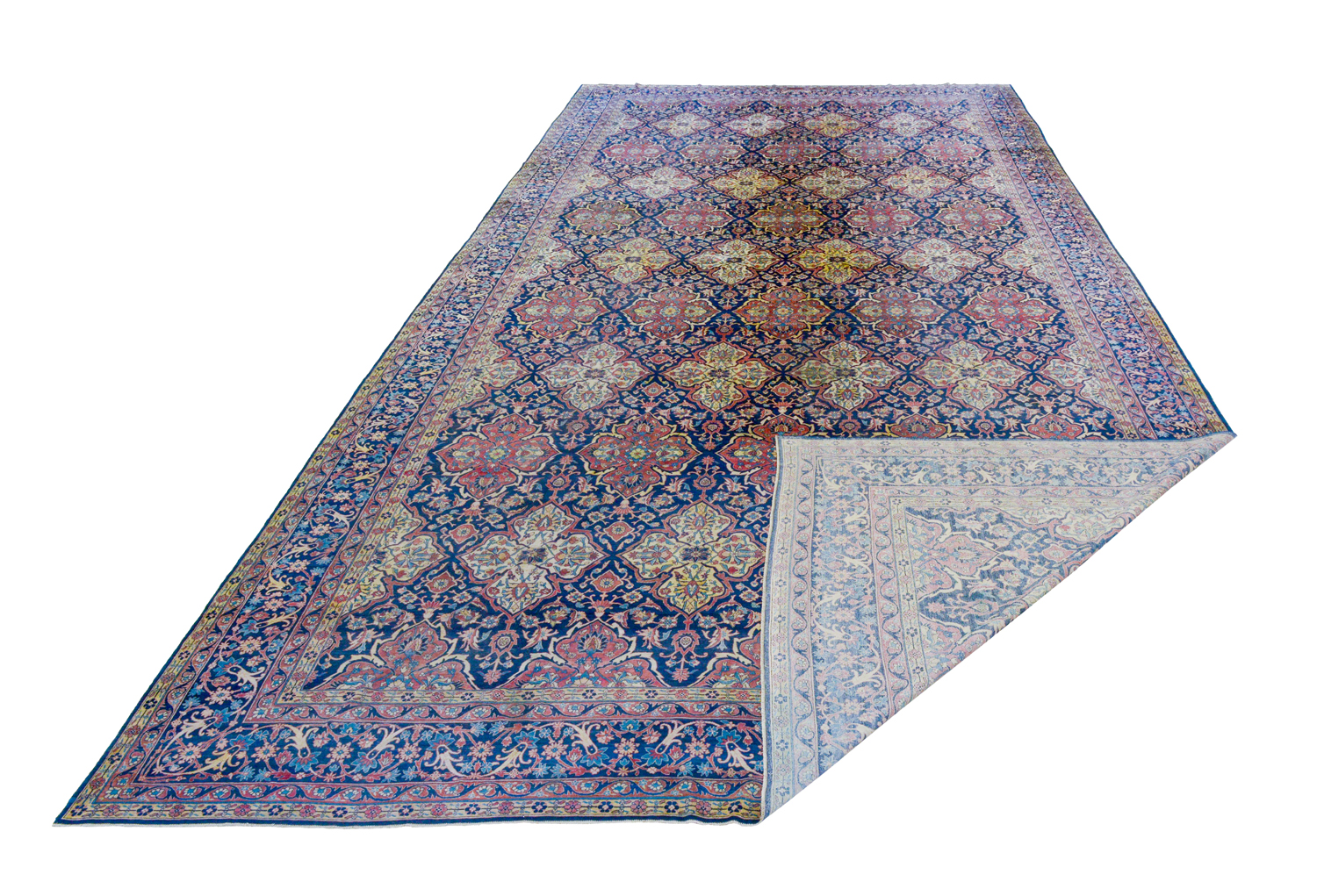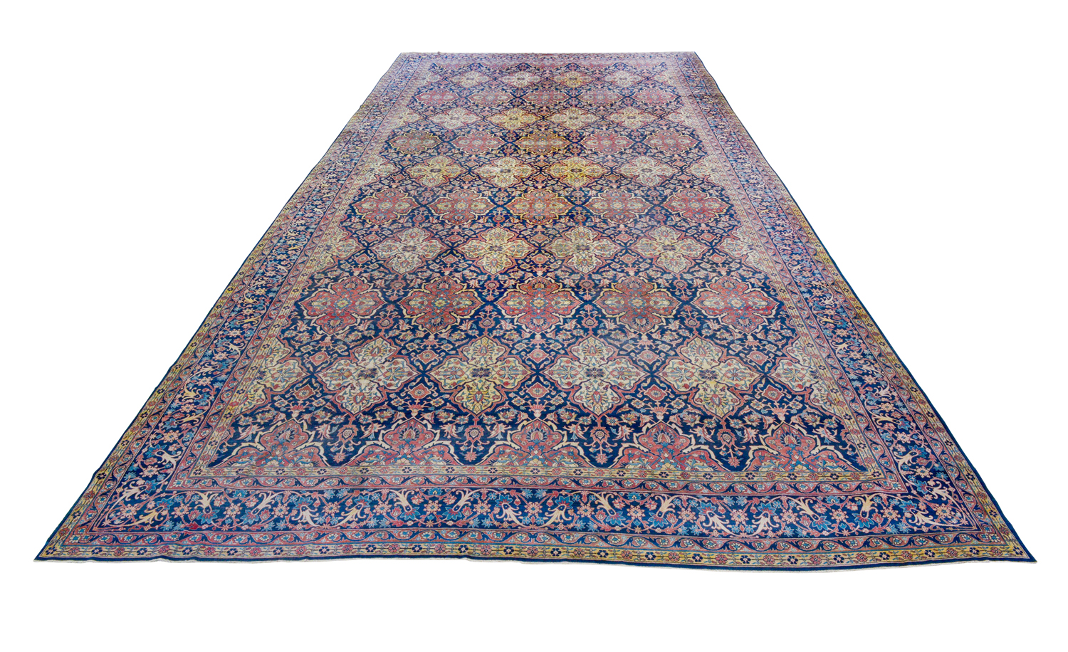 Il tappeto presenta una serie di medaglioni quadrilobati alternati, di colore avorio e rosso su fondo blu, disposti su file parallele e sfalsate, senza motivo centrale. La bordura principale, a fondo blu, è accompagnata da quattro cornici minori.