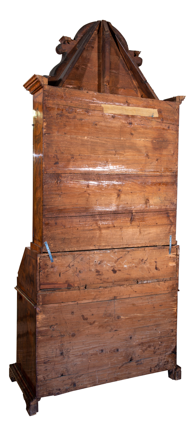 Stato di conservazione. Supporto: 70% (castelletto rifatto; cassetti interni rimaneggiati; cassetti del bureau con segni di scorrimento incongrui; rinforzo in tela su fessura della schiena)