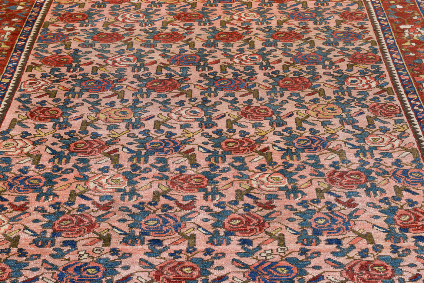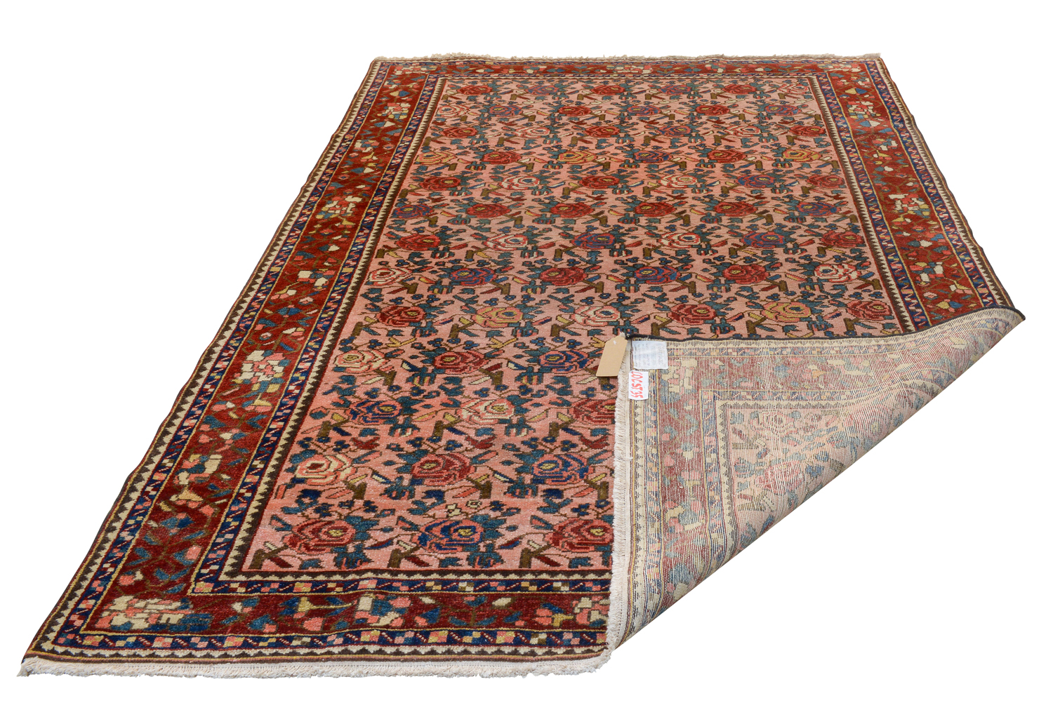 Disegno a rose sul campo salmone tipico della produzione dei tappeti Bakhtiyari di Fara-downbe, così come la tessitura con trama singola.