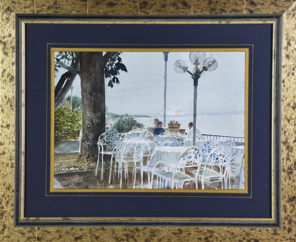 Ignoto TERRAZZA SUL MARE acquarello su carta, cm 25x35 firma Luino e data