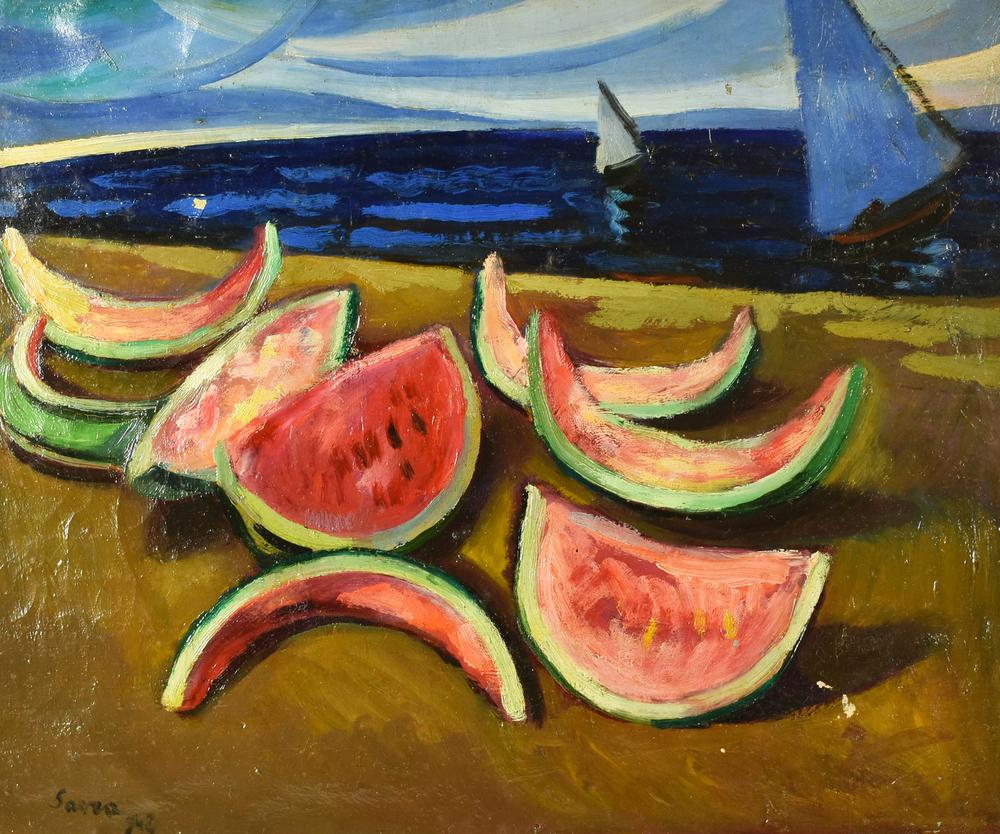 Manlio Sarra NATURA MORTA CON ANGURIE olio su tela, cm 50x60 firma e data...