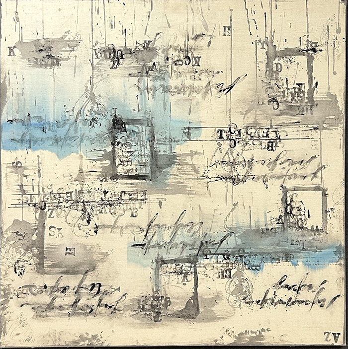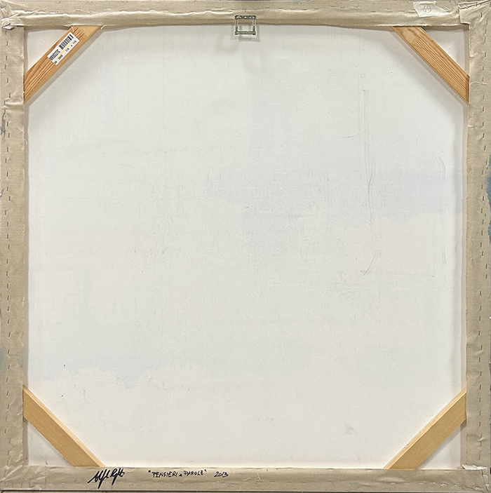 ALFREDO RAPETTI, "Pensieri, parole", 2013, tecnica mista su tela, dim. 115x115 cm. Al verso: titolo, anno e firma in basso a sinistra. Opera accompagnata da autentica su foto dell'artista. Opera senza cornice