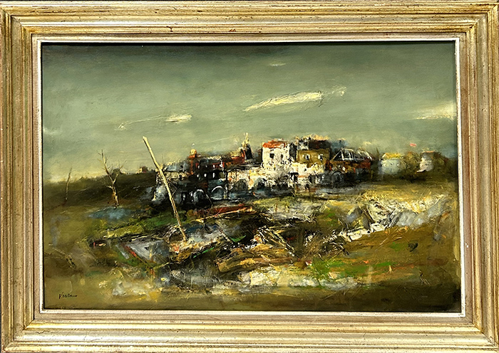 PIERO GARINO, "Paese", olio su tela, dim. 60x90 cm. Al fronte: firma in basso a sinistra. Al verso: titolo, firma, tecnica, dimensioni. Opera con cornice