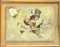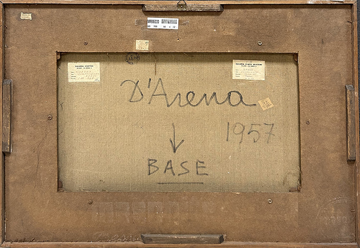 F. D'ARENA, "Composizione", 1957, olio su tela, dim. 50x73. Al fronte: firma in basso a destra. Al verso: firma, timbro, anno e etichette Galleria d'arte Selezione Milano via brera 14 e Galleria Schettini Milano via brera 14