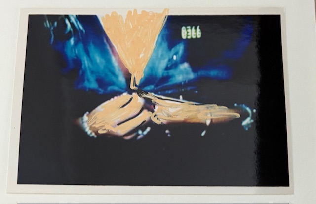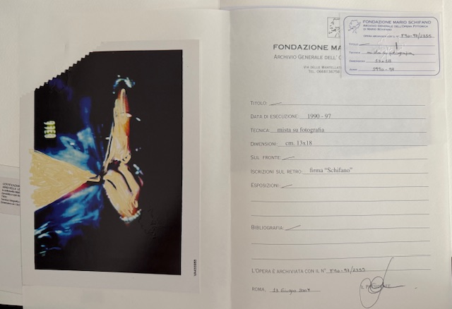 MARIO SCHIFANO, Senza titolo, 1990-97, tecnica mista su fotografia, dim. 13x18. Al verso: firma. Opera archiviata presso la fondazione Mario Schifano al N° F90-97/2355 a Roma in data 13/06/2007.