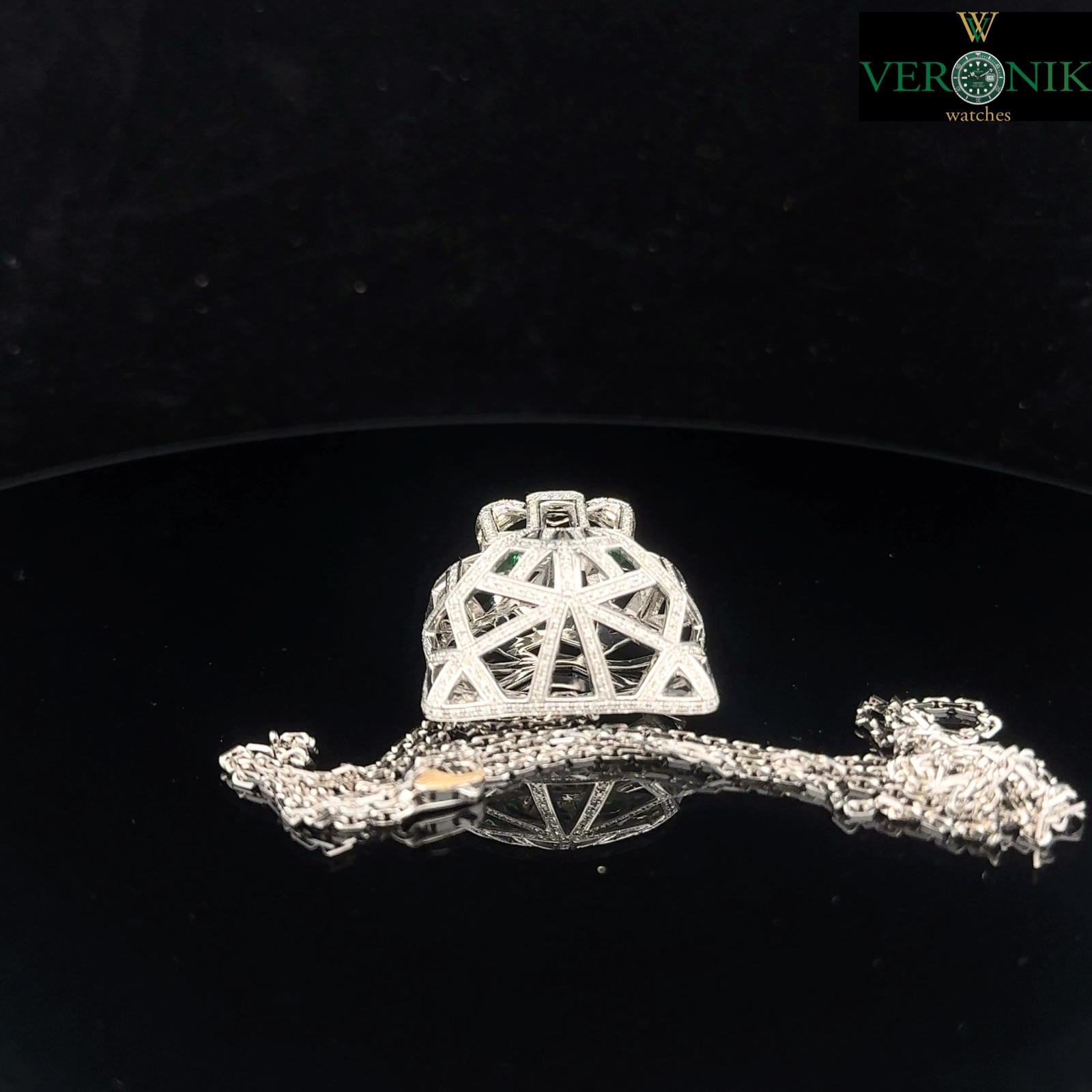 Catena oro bianco 18kt con ciondolo a forma di testa di pantera tempestata di diamanti e 2 smeraldi.