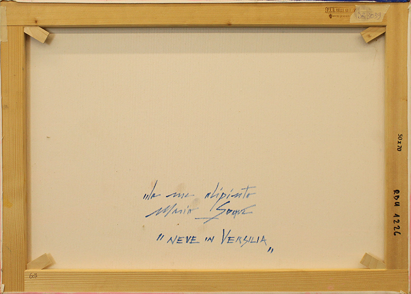 MARIO SOAVE, "Neve in Versilia", anni 2000, olio su tela, cm 50x70x2, peso 1 kg. Al fronte: firma in basso a destra. Al verso: in basso al centro dichiarazione di autenticità da parte dell'artista, firma e titolo. Opera con certificato di provenienza della Daliano Ribani Arte. Opera con cornice in omaggio.