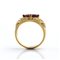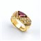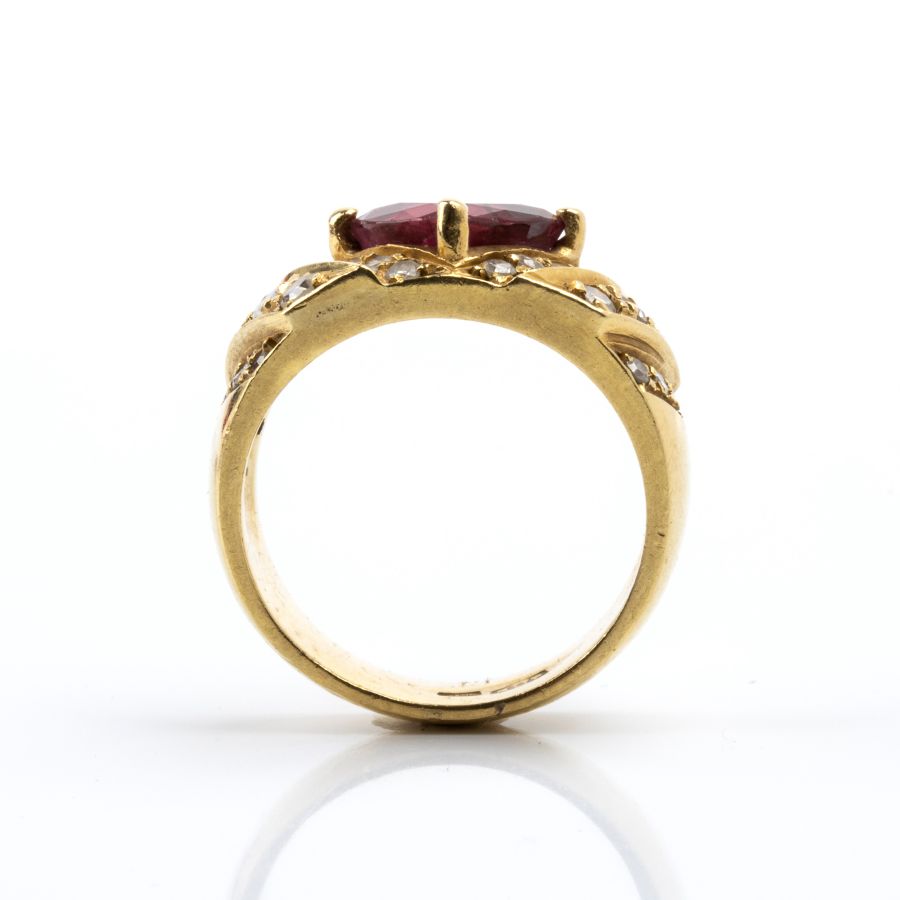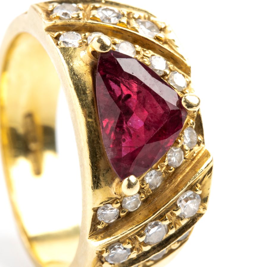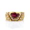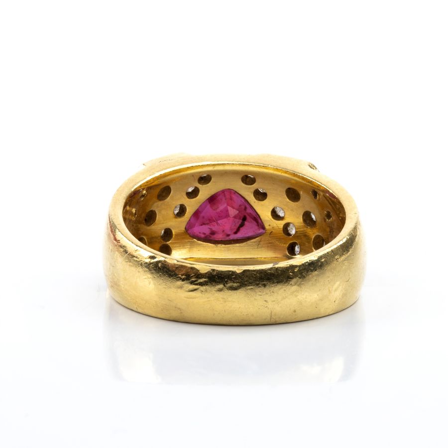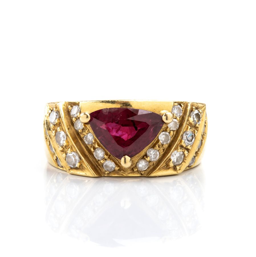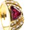 modellato come una fascia in oro giallo 18k, incastonato con rubino affiancato da nastri in diamanti.