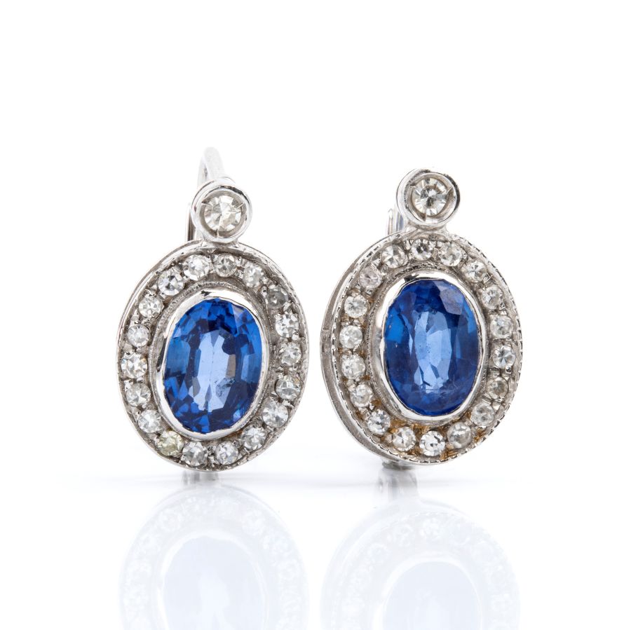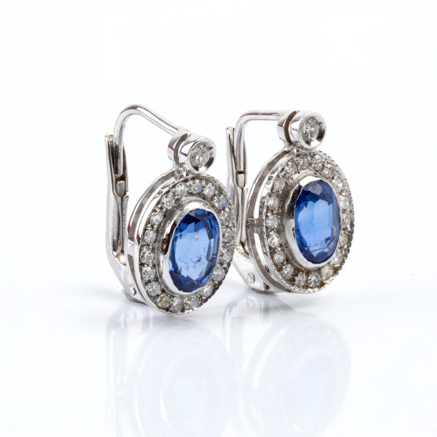 di forma ovale, impreziositi da n. 02 zaffiri di forma ovale, circa 2.05 ct totali, e n. 38 diamanti di forma rotonda, taglio huit-huit, circa 0.40 ct, G-H, VVS-VS.
