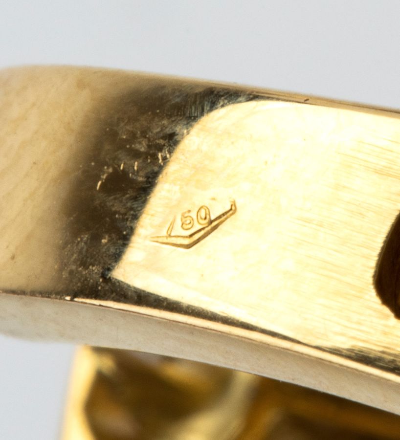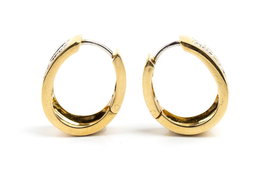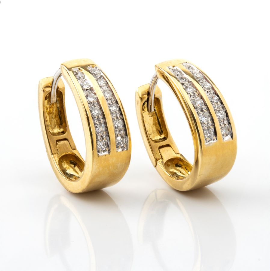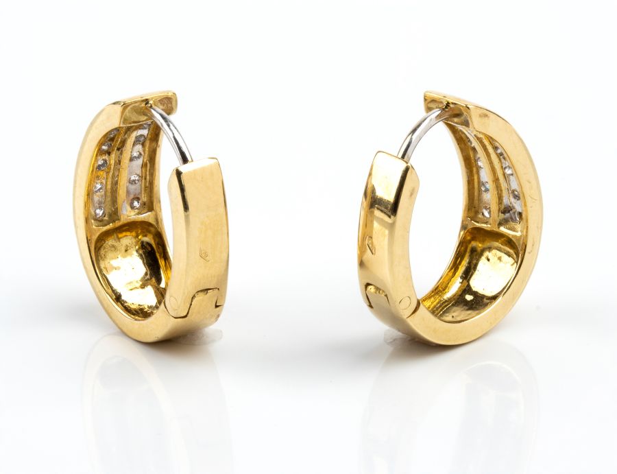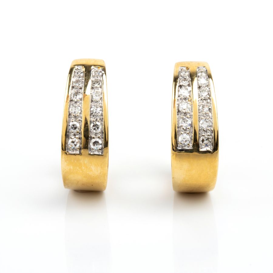 in oro giallo 18k, ciascuno incastonato con due file di diamanti rotondi, taglio huit-huit, stimati per un peso totale di circa 0.55 ct, colore G-H, purezza VVS- VS, come misurati e classificati nella montatura.