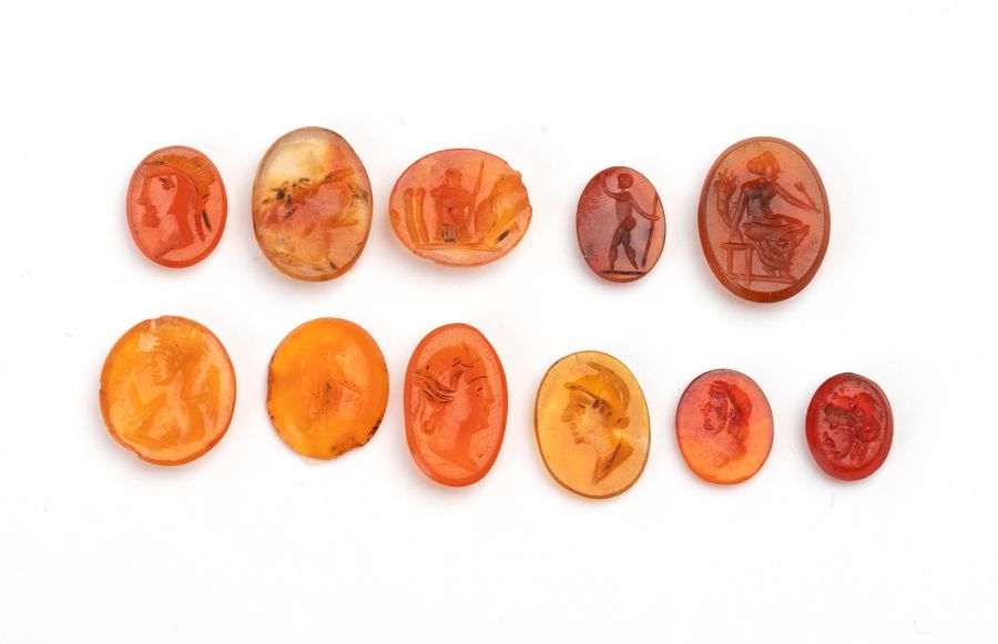 Soggetti vari ispirati da modelli classici: tre profili maschili; un profilo raffigurante un guerriero; due profili femminili con i capelli raccolti; tre figure raffiguranti allegorie della mitologia romana; due raffiguranti un pescatore e un contadino.