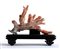 Il ramo intagliato con una composizione con due personaggi su una barca che solca le onde, base in legno.
