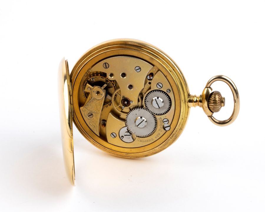 Doppia cassa savonette in oro 18k, quadrante in smalto bianco con numeri arabi e secondi alle ore 6, firmato Jupiter. Movimento con scappamento ad ancora 15 rubini e carica a remontoir.