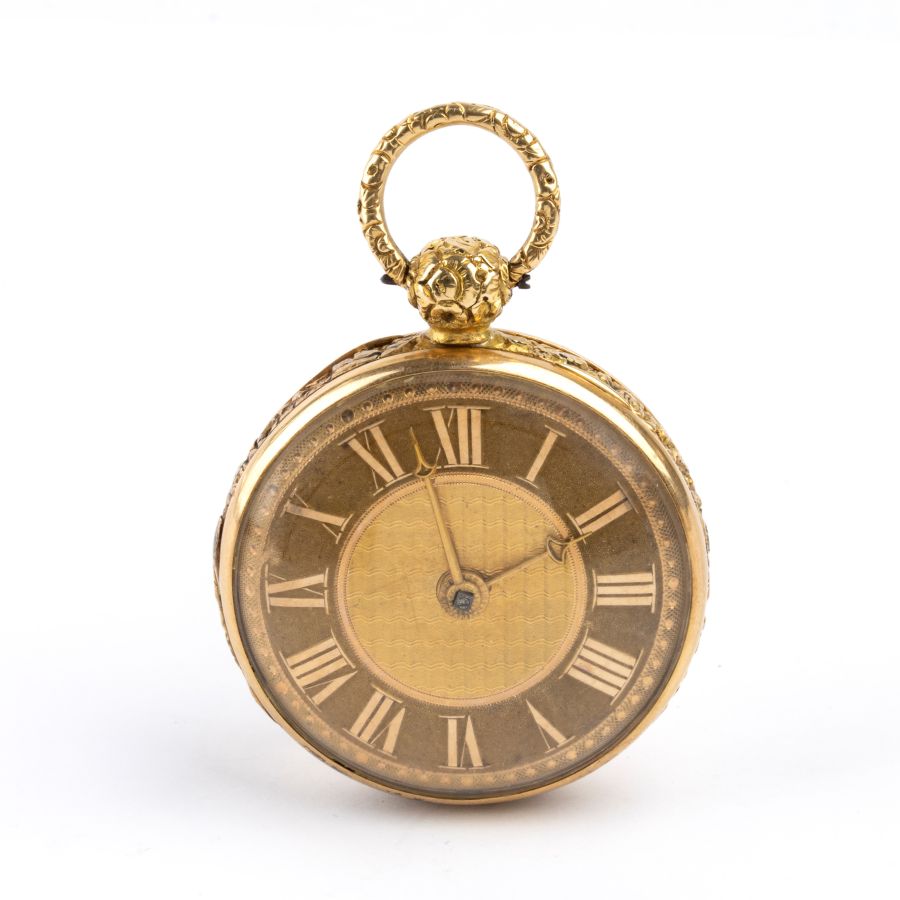 Cassa in oro 18k, quadrante dorato con numeri arabi. Movimento con scappamento a verga e carica a chiave.
