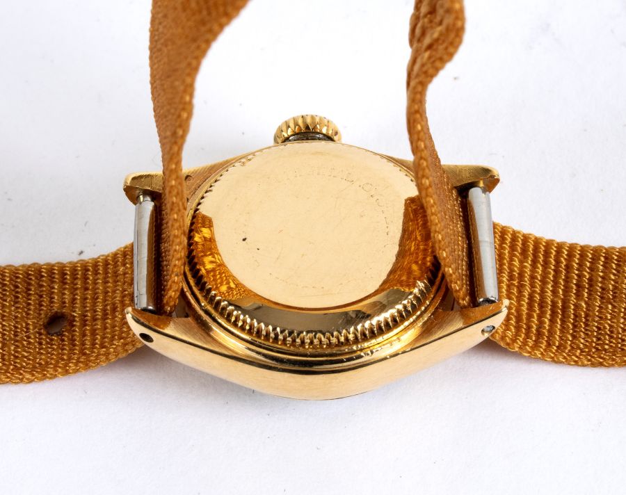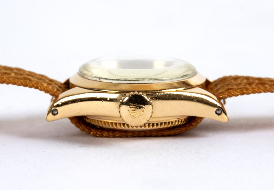 cassa oyster in oro, movimento meccanico a carica automatica, base falsa, quadrante argentè con indici a sfera "gladio". Referenza 7951, matricola 344297. Cinturino commerciale in tessuto.