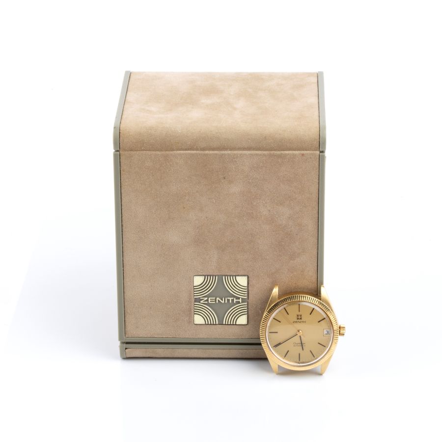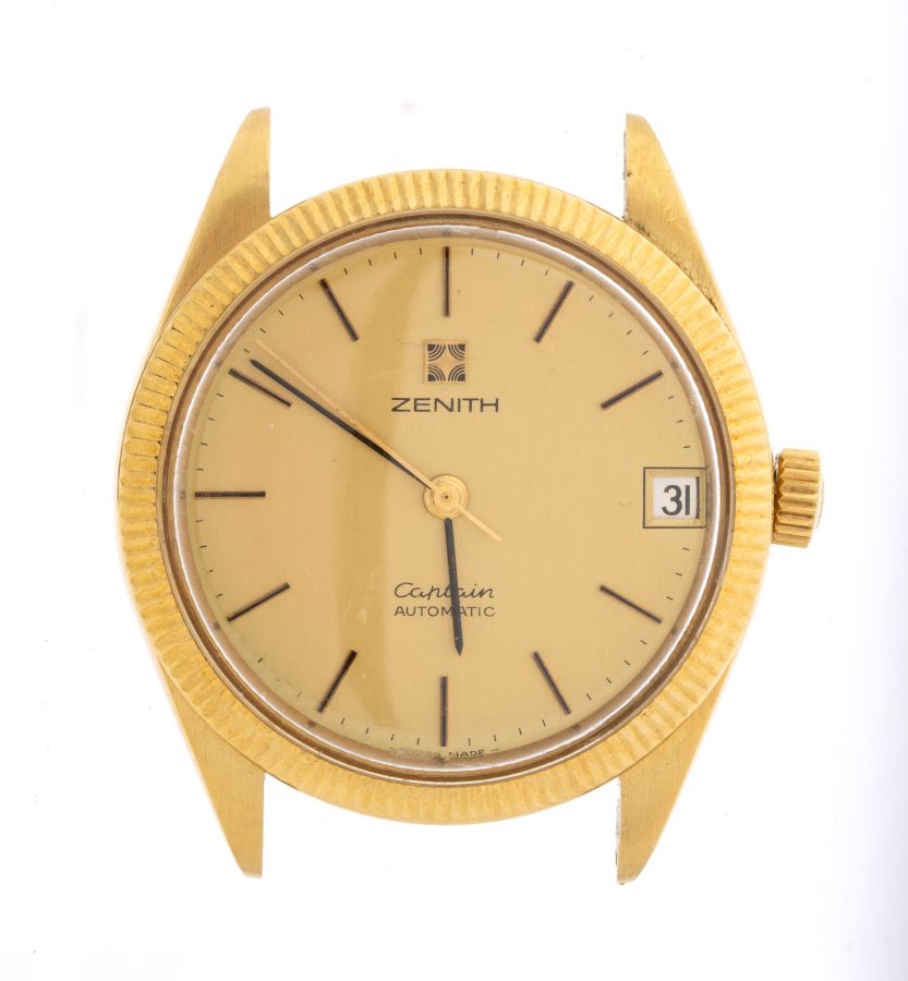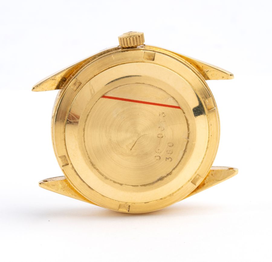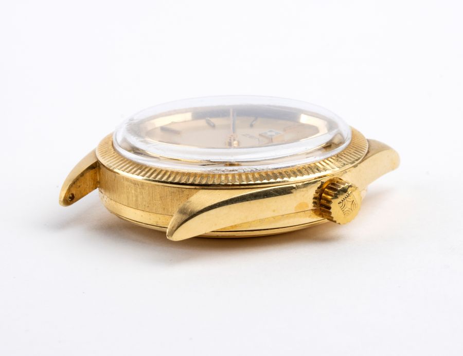 cassa in oro 18k, quadrante champagne con indici e sfere nere, datario allle ore 9. Movimento automatico cal 2572.