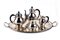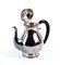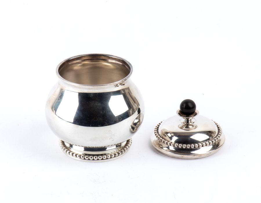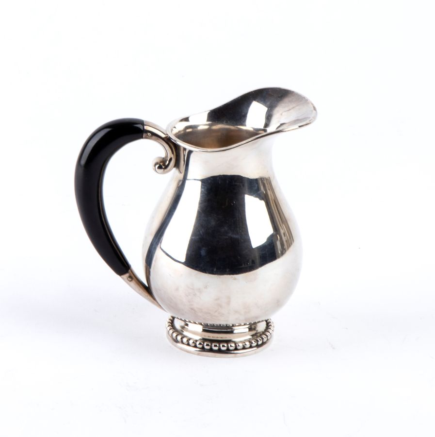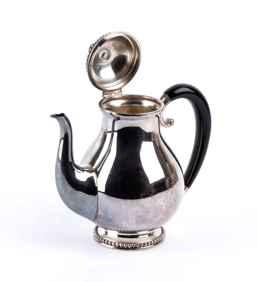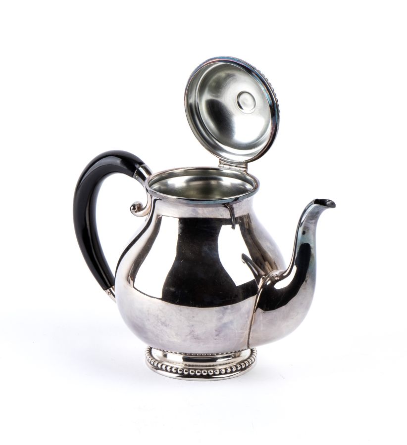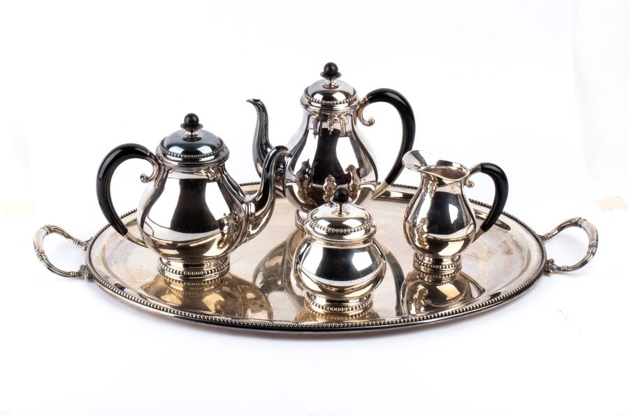 Peso lordo complessivo: 3280 gr. servizio da tè in argento 800/1000, formato da teiera, caffettiera, zuccheriera, latteria e un vassoio di forma ellittica, decorati con bordi a piccole sfere e prese di colore nero.
