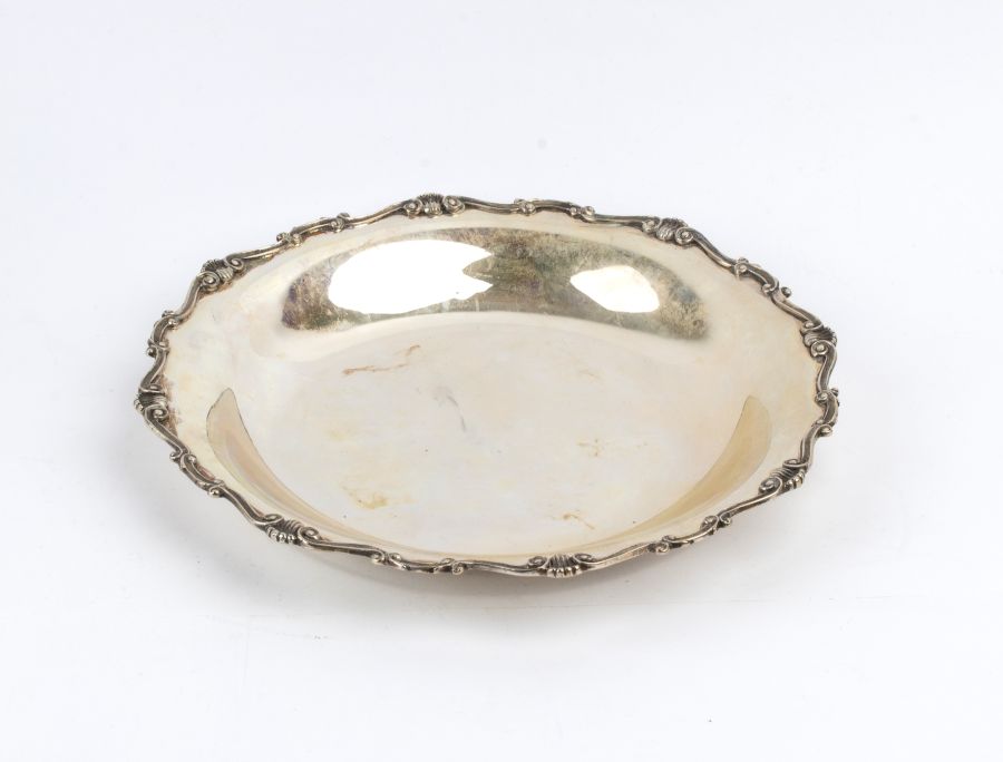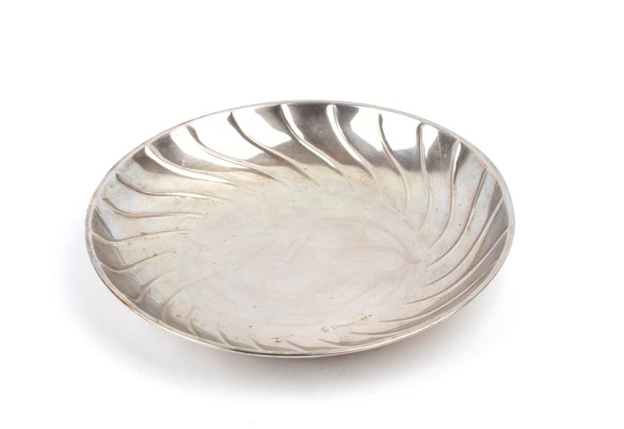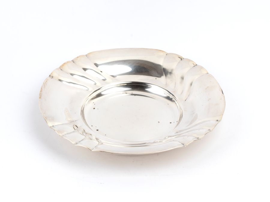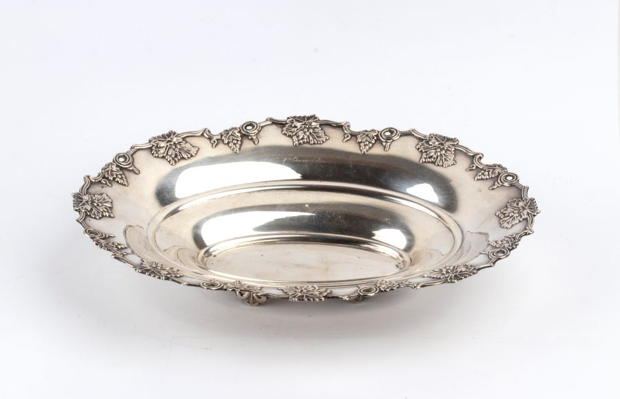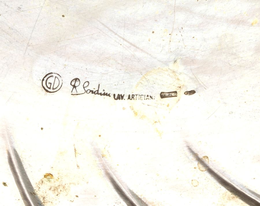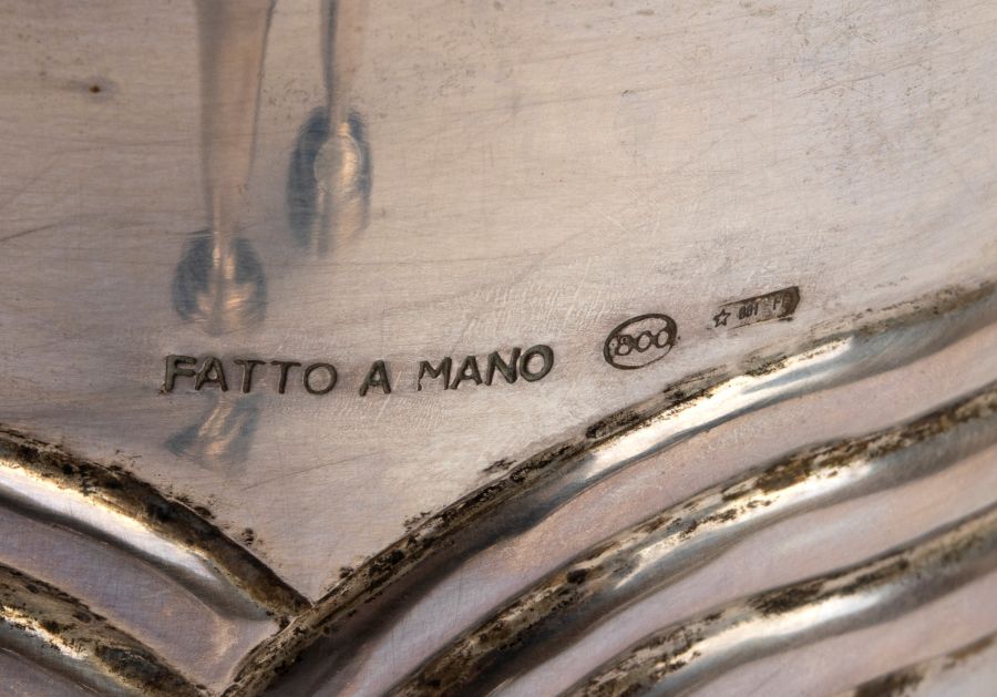 un vassoio presenta i marchi per l'argento 800/1000, punzonata "800", "741FI", argentiere R.Sordini;