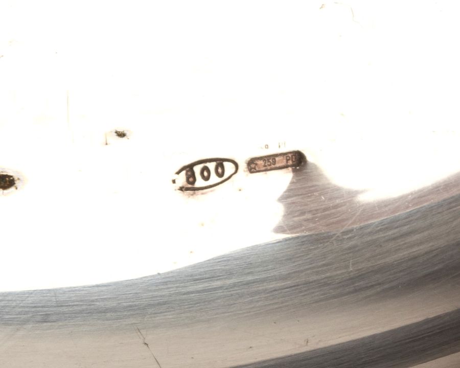 un vassoio presenta i marchi per l'argento 800/1000, punzonata "800" e "259 PI";