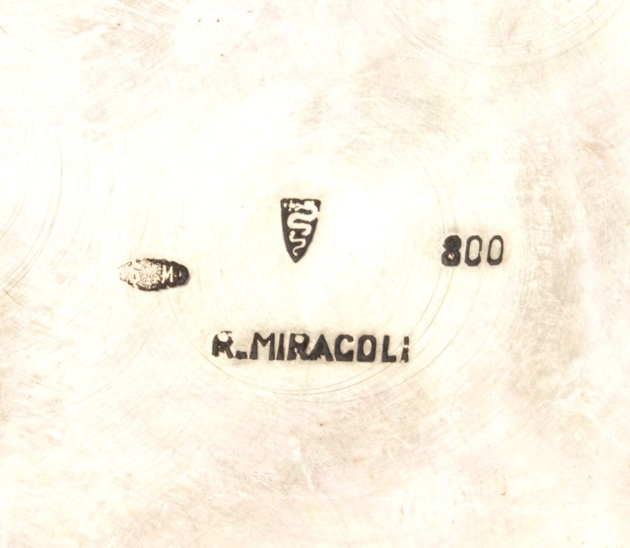 un vassoio presenta i marchi per l'argento 800/1000, punzonata "800", argentiere R. Miracoli;