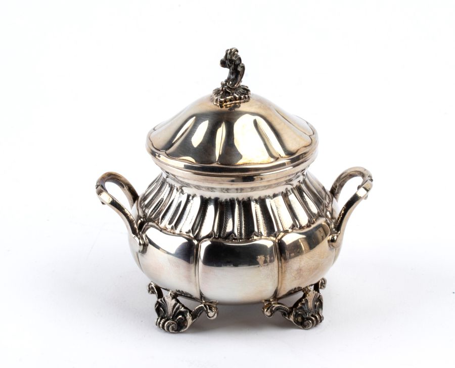 la zuccheriera presenta i marchi per l'argento 800/1000, punzonata "800", "971 AL", argentiere Enrico Goretta;