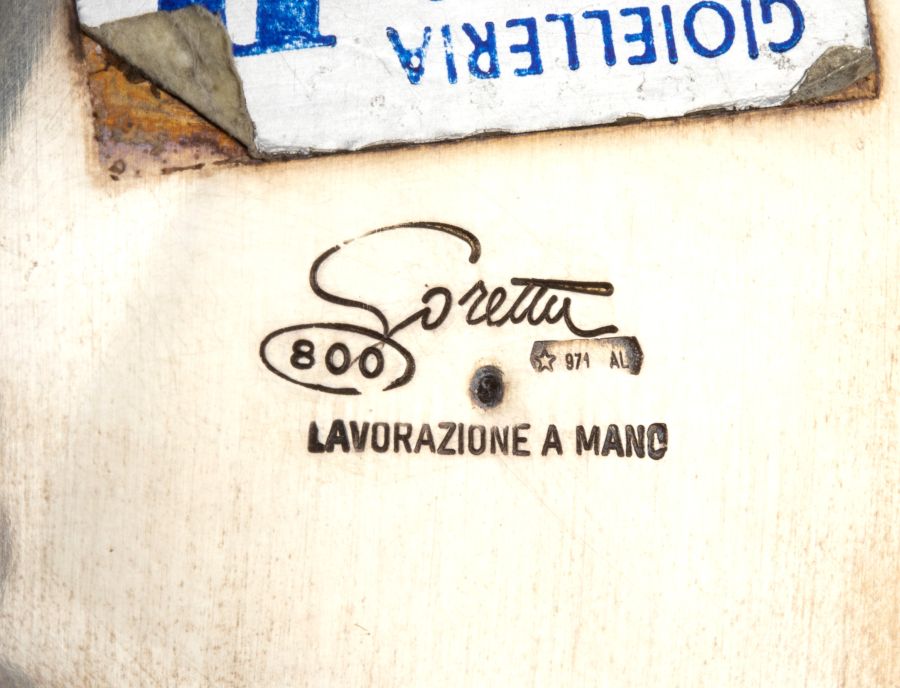 Il porta bottiglia presenta i marchi per l'argento 800/1000, punzonata "800", "881 FI", "FATTO A MANO";