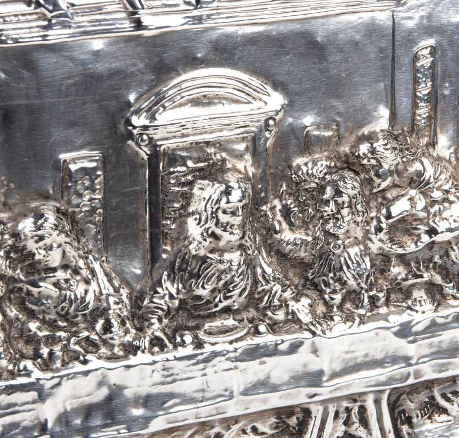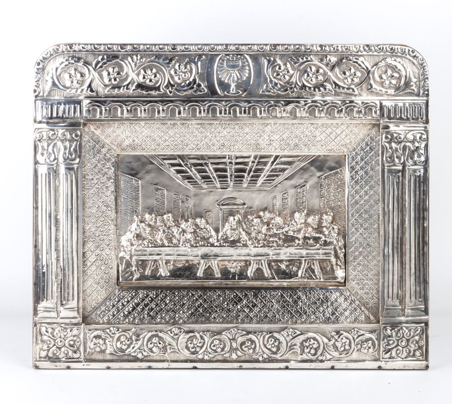Ultima Cena in argento con dedica a Don Mario Zanin Metà XX secolo Altezza x larghezza x profondità: 2,5 x 43 x 53 cm. Peso lordo complessivo: 2580 gr.