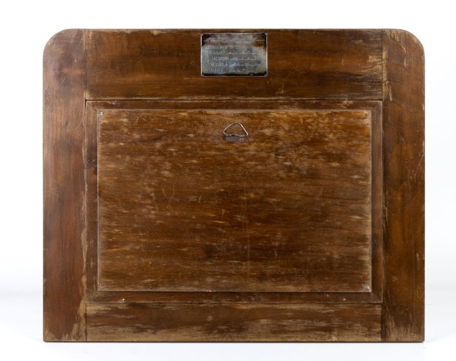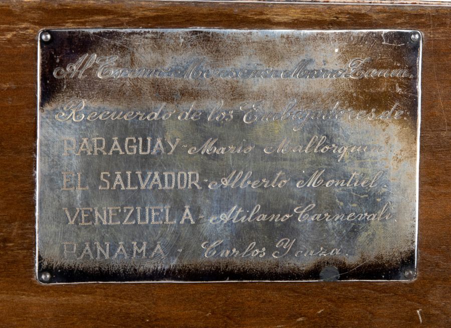 Sul retro, una targhetta riporta la seguente dicitura: "Al Esemio Monsenior Mario Zanin. Recuerdo de los Embasciatores: Paraguay - Mario Mallorquin; El Salvador - Alberto Montiel; Venezuela - Atilano Carnevali; Panama - Carlos Ycaza".