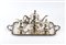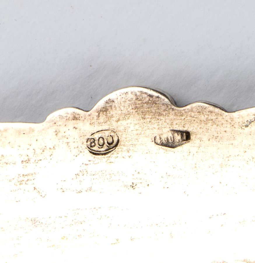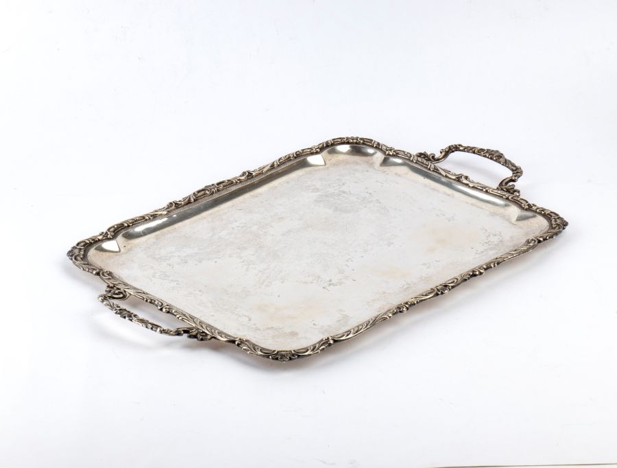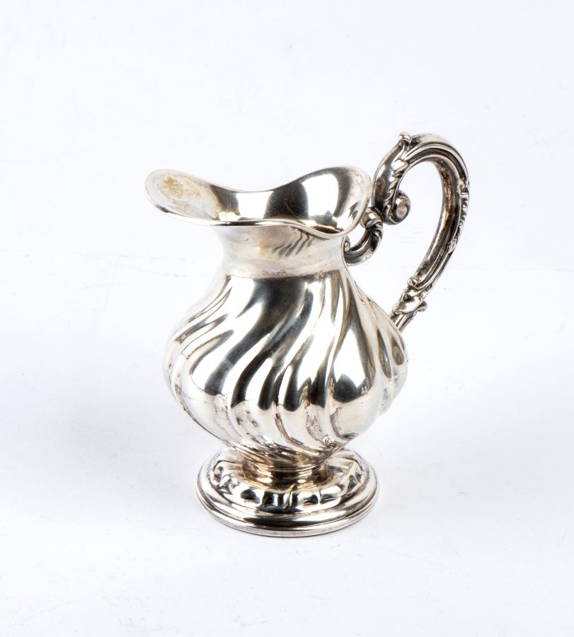 Peso totale: 1890 gr. composto da un vassoio, una caffettiera, una zuccheriera, e una lattiera, decorati con nervature tortili e motivi a volute. La caffettiera presenta dei distanziatori termici in osso.