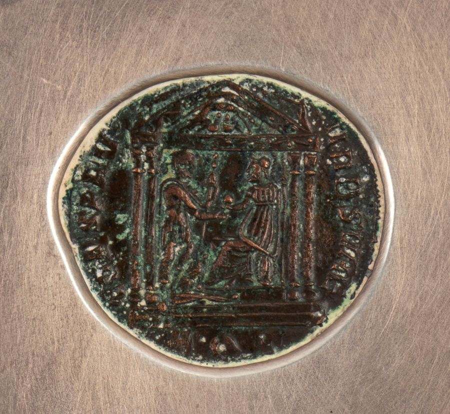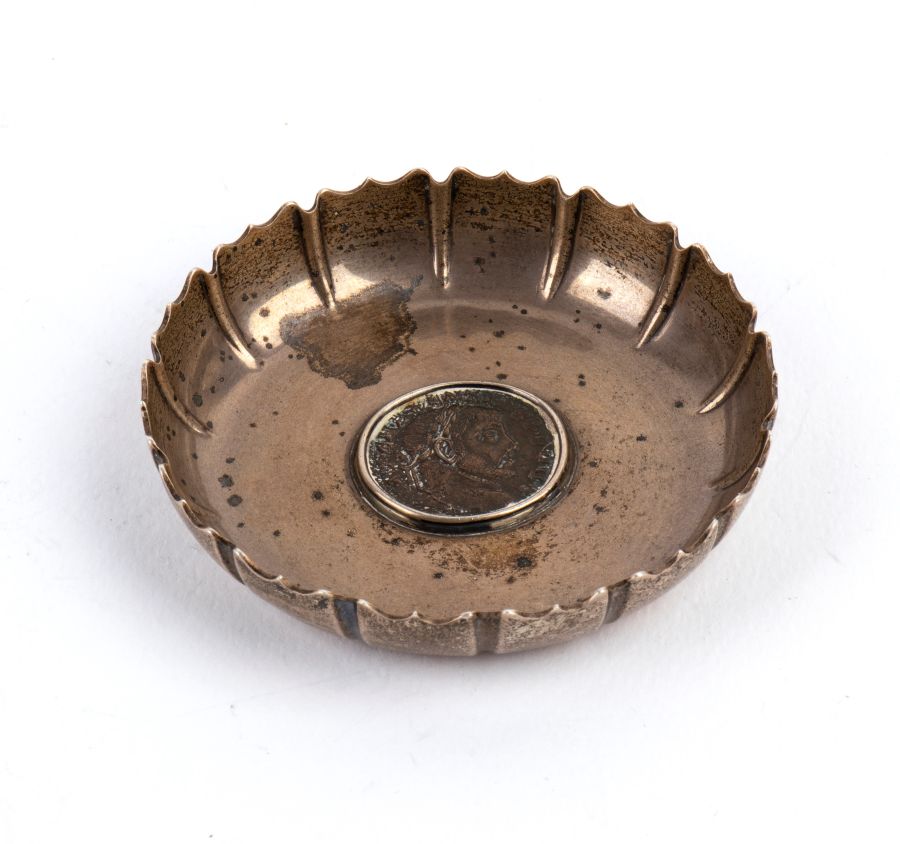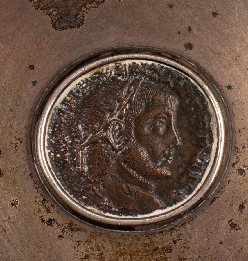 Diametro: 8 cm. Peso: 68 gr. di forma circolare, incastonato con un Follis di MASSENZIO, 306 - 312 d.C.