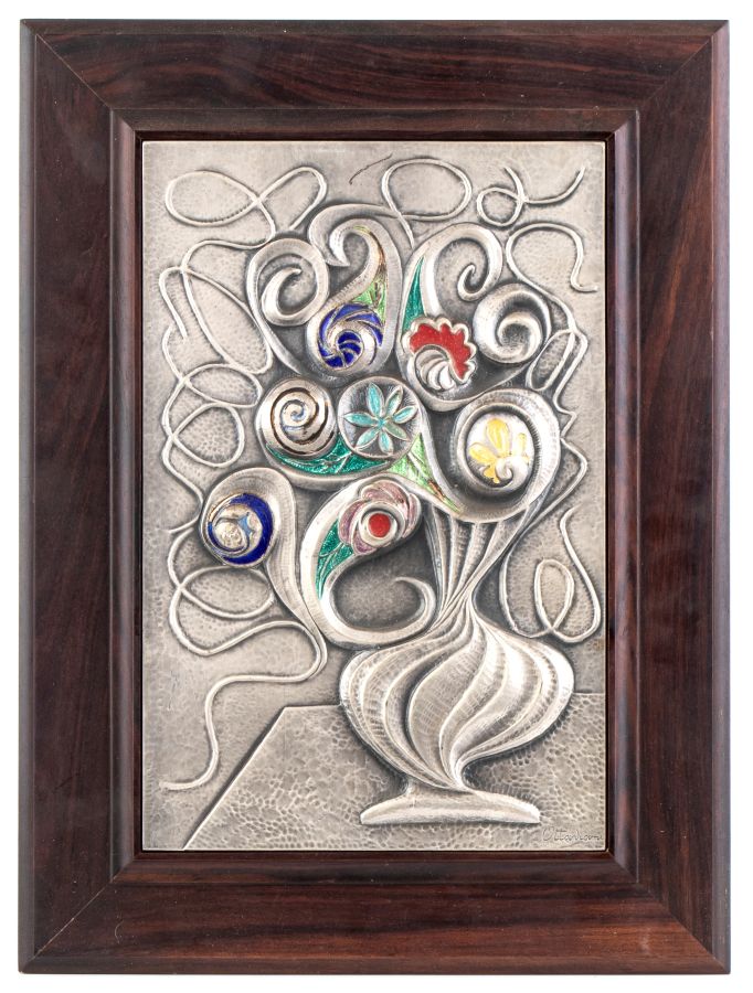 con cornice originale in legno, lastra in argento 925/1000 sbalzato a raffigurare un vaso da fiori, decorato con applicazioni in smalti policromi. Firmato OTTAVIANI, argentiere attivo a metà del Novecento.