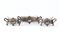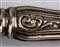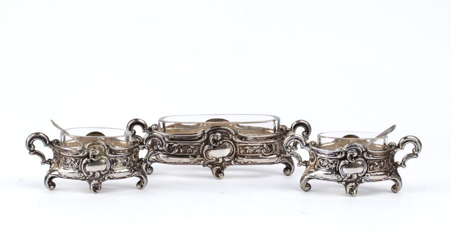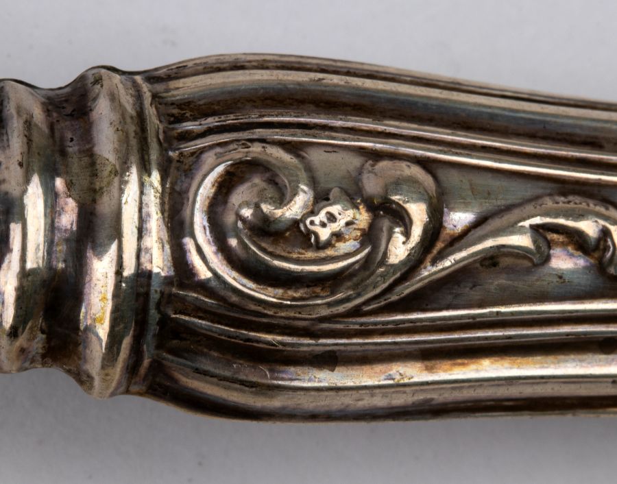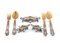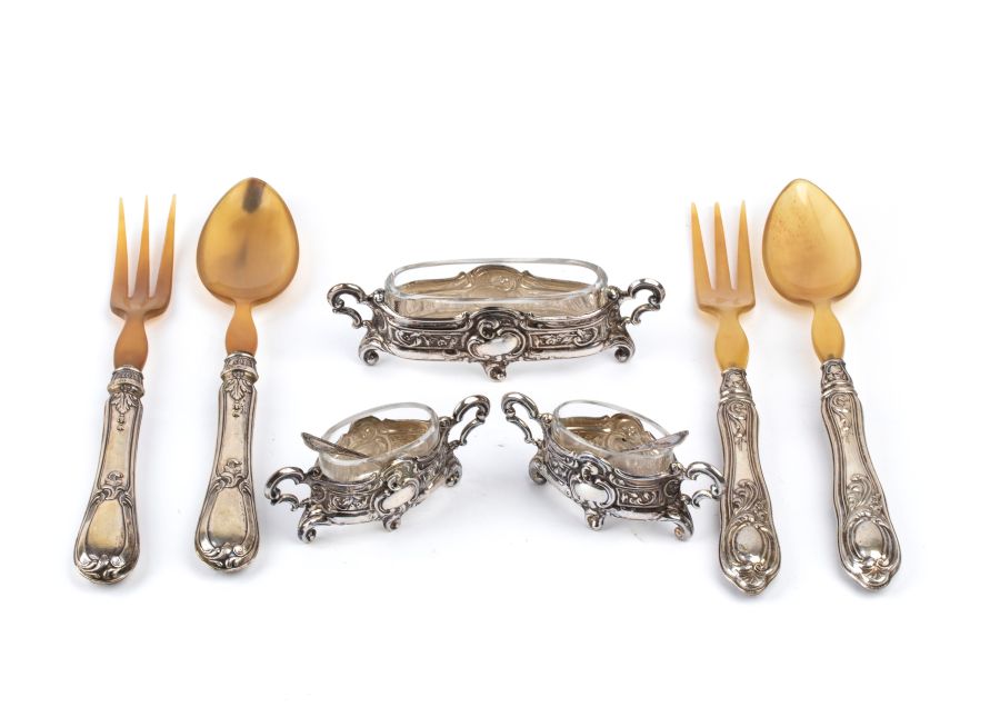 Peso lordo complessivo: 425 gr. in argento, composto da: tre ciotoline, due cucchiai e due forchette da portata. Gli oggetti presentano una decorazione a volute fogliate e floreali. Le coppe dei cucchiai e le teste delle forchette sono realizzate in corno color miele; le ciotole presentano elementi in vetro.