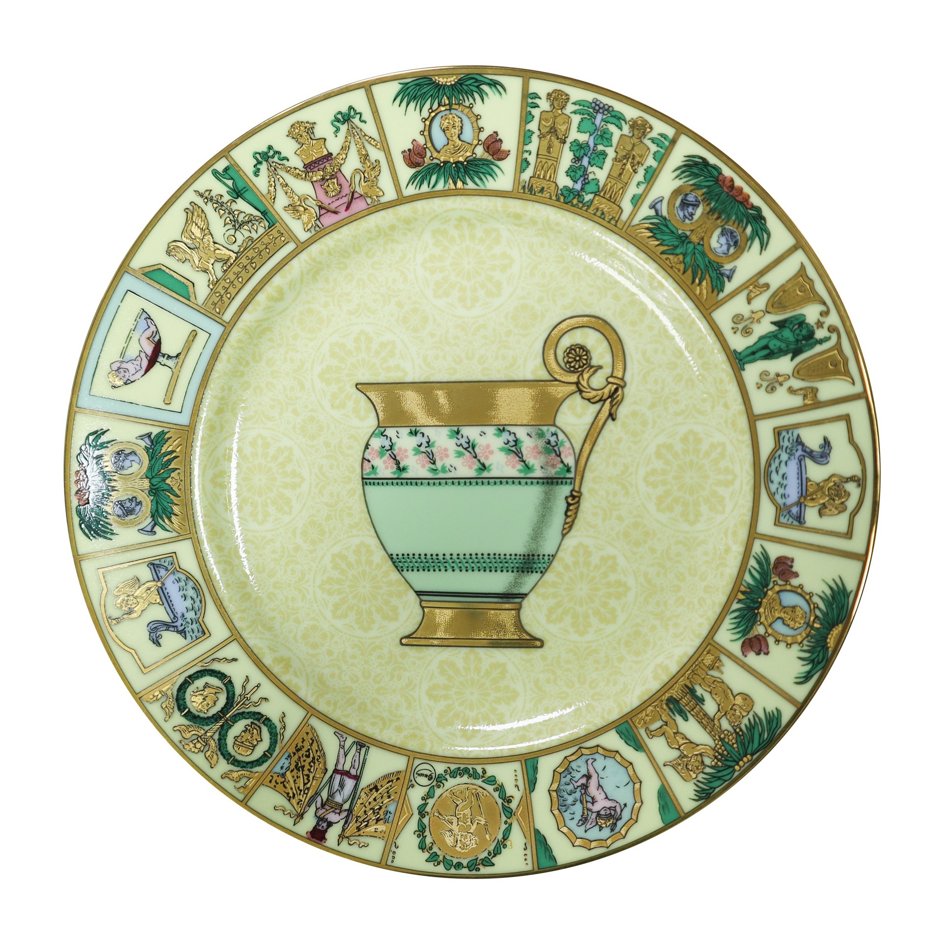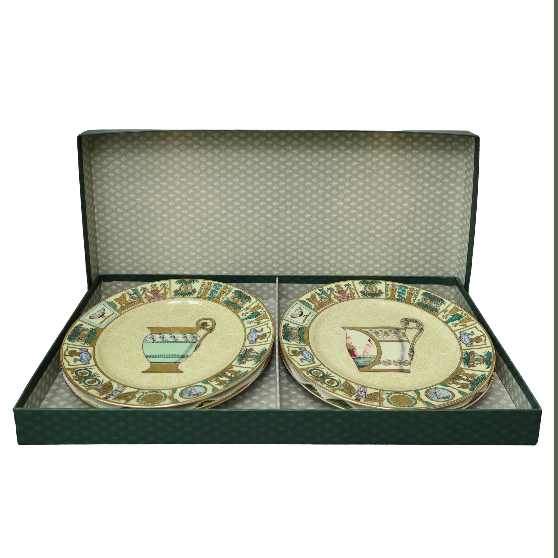 Gucci - Set di quattro piatti da parete in porcellana con decorazione multicolore e dorata, 1980s Scatola originale e divisore firmato in panno