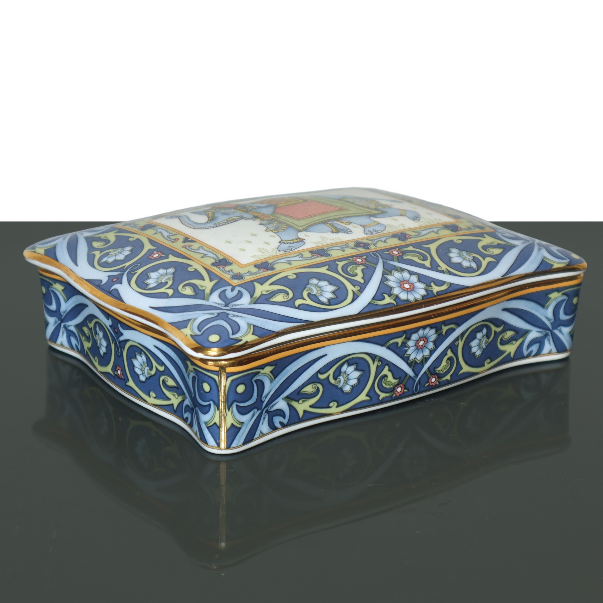 Wedgwood Made in England - Trittico in porcellana bone china modello Blue Elephant, composto da posacenere, orologio, scatola portaoggetti con carte da gioco, 1992 Posacenere cm 20x16, Orologio H cm 9 Portaoggetti H12x13,