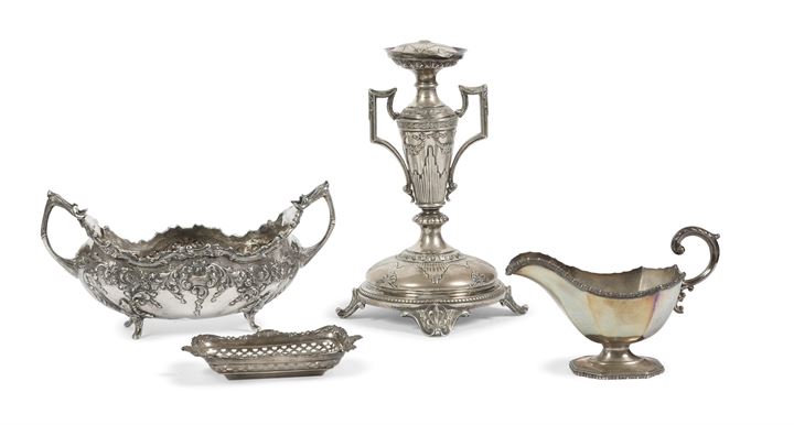 Composto da una salsiera, un centrotavola e un piattino traforato 925/1000; un'alzata sbalzata con manici