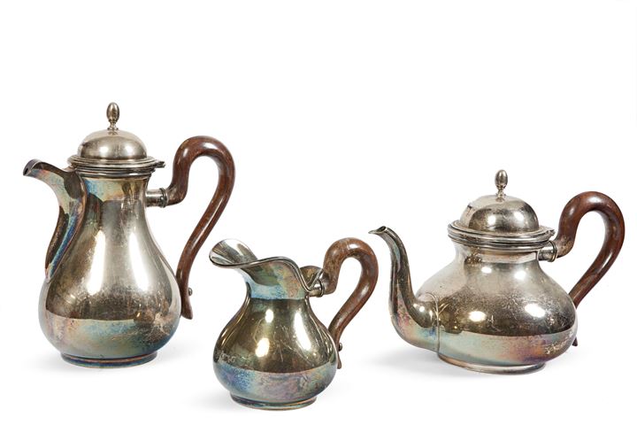 Composto da: caffettiera, teiera e lattiera con manici in legno, di forma bombata