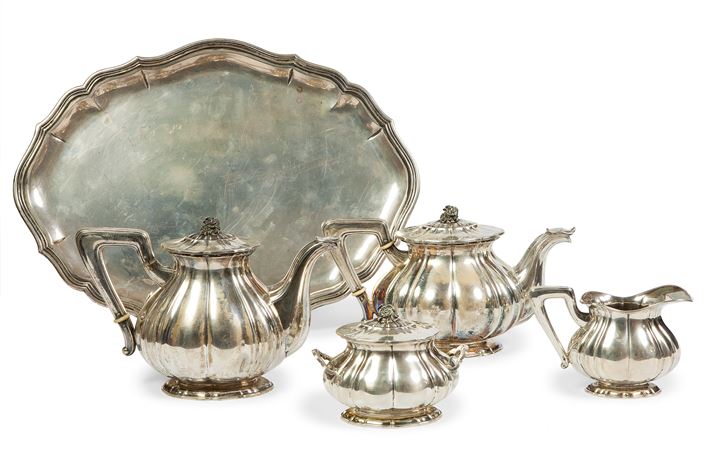 Composto da lattiera, caffettiera, teiera, zuccheriera e vassoio, di gusto barocco. Cesa, Alessandria