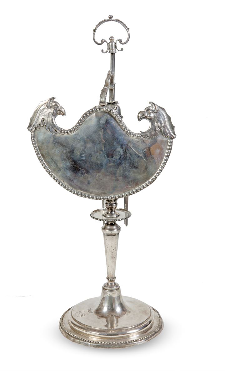 Napoli seconda metà XVIII secolo, reca il datario "177...". Poggiante su base circolare; inciso stemma nobiliare; completa di accessori: Ventola sbalzata a motivo di teste d'aquila