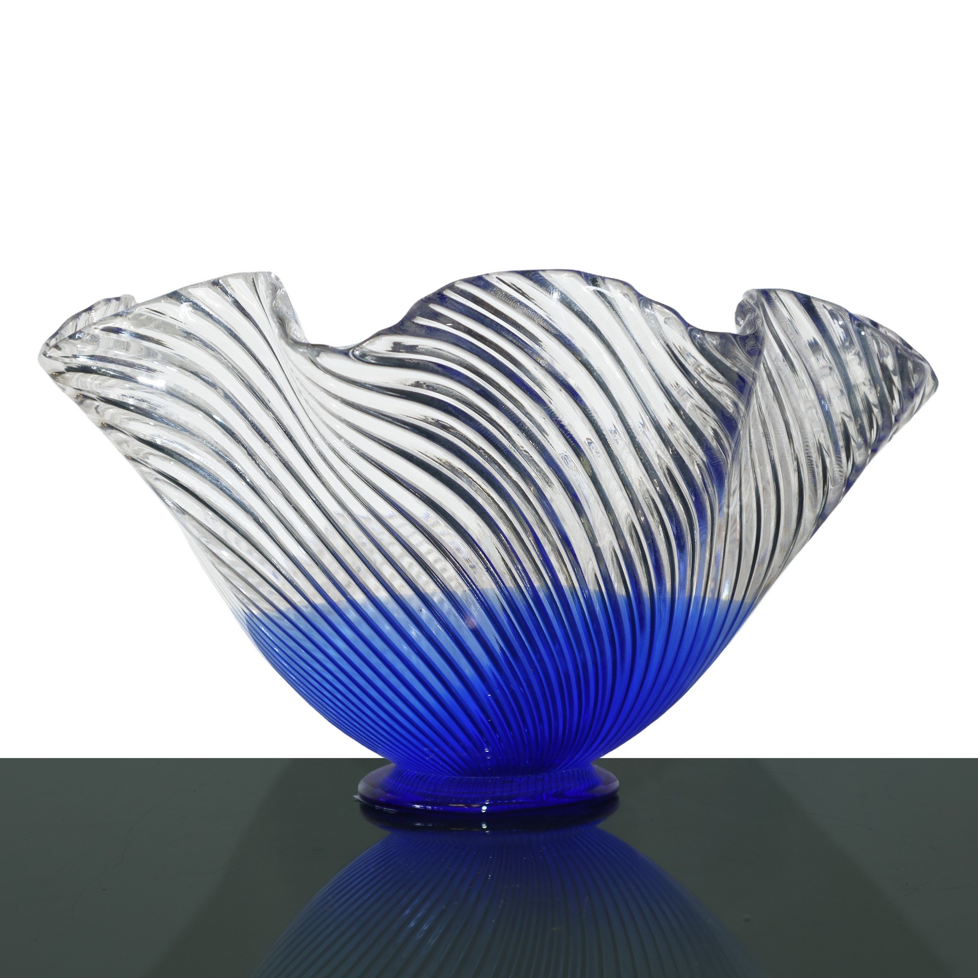 Centrotavola in vetro trasparente con bordo ondulato e fondo blu, 20° secolo
