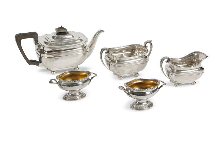 925/1000 composto da un servizio, città di Sheffield 1923, composto da teiera, lattiera,zuccheriera, manici e prese in legno, e una coppia di saliere con manici, città di Londra 1820, interno dorato