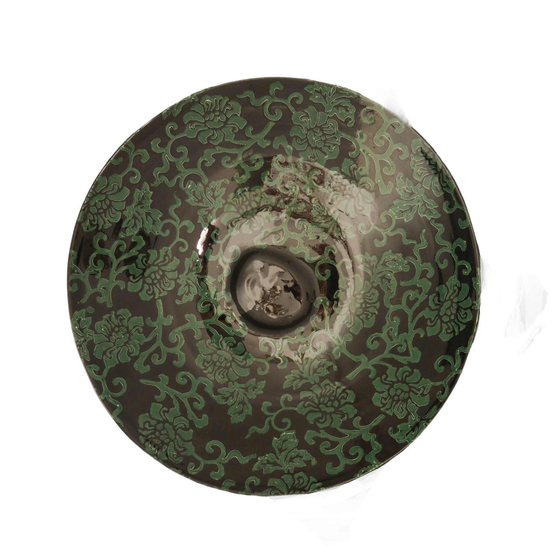 Sia Home Design - Piatto in maiolica a motivi floreali verdi su base nera, France 20° secolo diametro cm 40