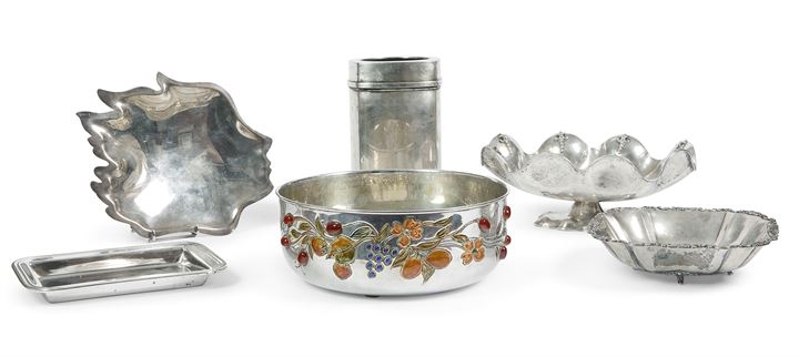 Composto da: due piatti 925/1000, firmati rispettivamente "Casseti" e "De Vecchi"; tre centrotavola di forma rotonda di cui uno con pietre e smalti sul fronte ed un portabottiglie