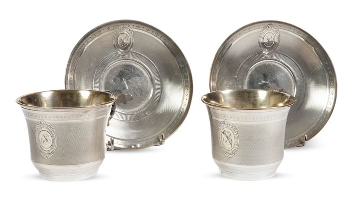 COPPIA DI TAZZE CON PIATTINI IN ARGENTO Peso gr 570 Francia, seconda metà XIX...
