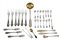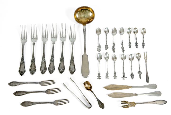Fine XIX secolo/inizi XX secolo, titolo 84 Zolotnik, composto da: nove forchette, due coltelli da pesce, un mestolo, 14 cucchiaini, una pinza per zucchero