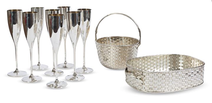 Composto da: otto calici, con interno dorato; due cestini lavorati ad intreccio a raffigurare il vimini