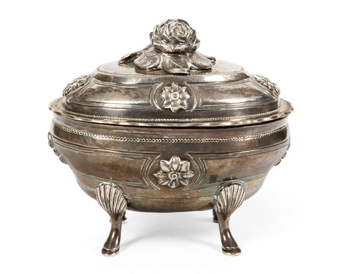 Piemonte seconda metà del XVIII secolo, controassaggiatore Giuseppe Fontana; poggiante su quattro piedini, sbalzata con motivi floreali. Presa a forma di rosa